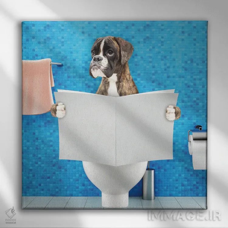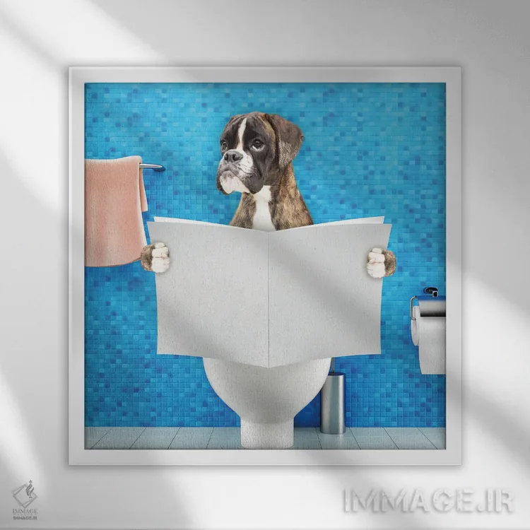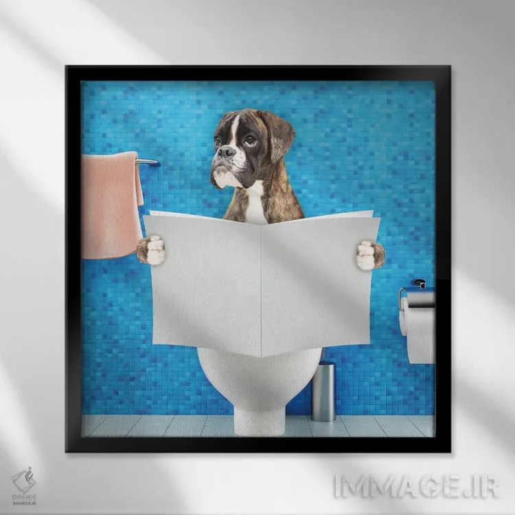 تابلو بوکسور نشسته روی سنگ توالت در حال مطالعه اثر هلگا۱۹۸۱ (هنرمند دیجیتال) - نمای روبه‌رو روی دیوار