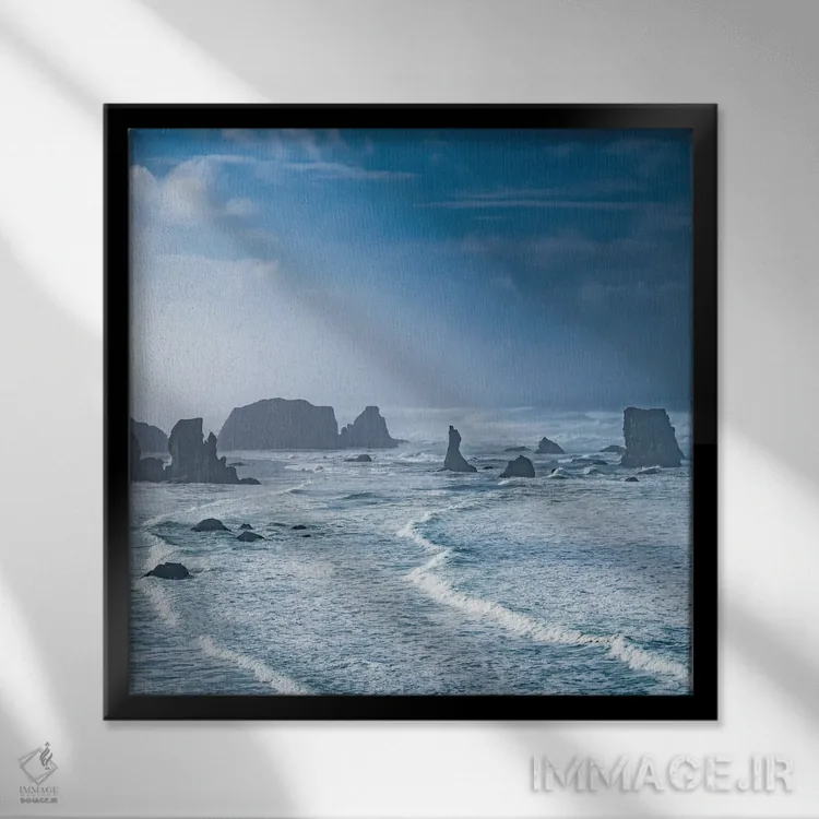 براساس پالت سرد اثر، قاب سفید مات (فریم باریک) پیشنهاد اول است و نقرهای برسخورده (متالیک) مکمل. برای سفارشهای پروژهای با ابعاد و قابهای اختصاصی با ایماژ در تماس باشید.