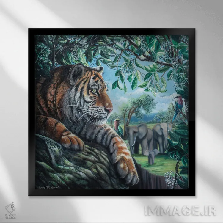 براساس پالت ترکیبی اثر، قاب تیک گرم (چوبی) پیشنهاد اول است و مشکی مات (فریم متوسط) مکمل. برای سفارشهای پروژهای با ابعاد و قابهای اختصاصی با ایماژ در تماس باشید.