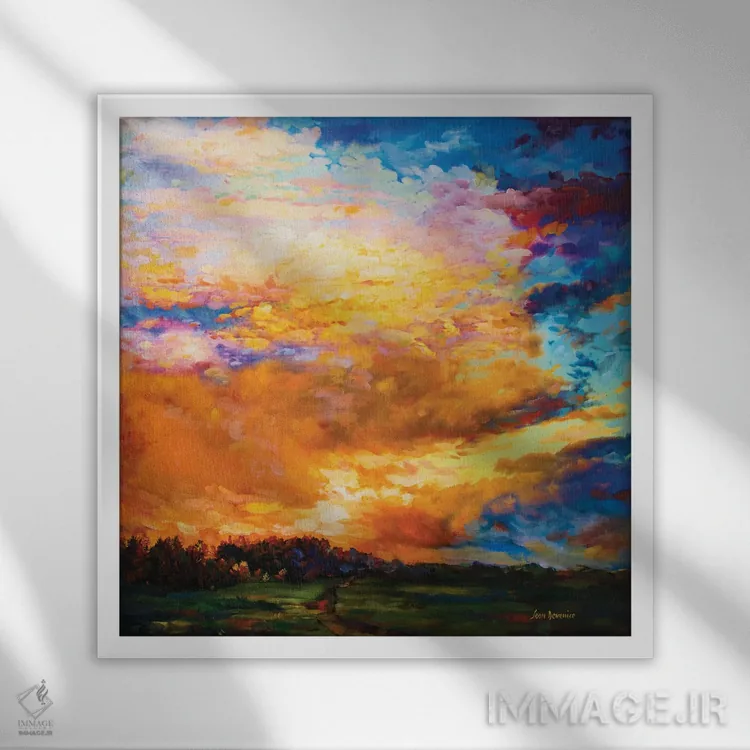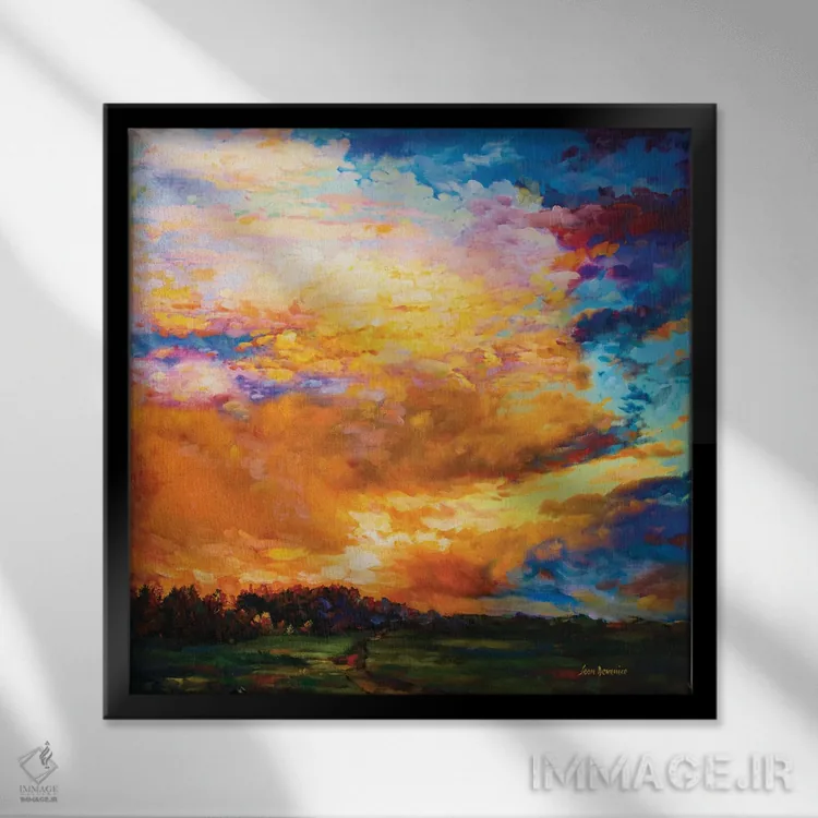 براساس پالت ترکیبی اثر، قاب تیک گرم (چوبی) پیشنهاد اول است و مشکی مات (فریم متوسط) مکمل. برای سفارشهای پروژهای با ابعاد و قابهای اختصاصی با ایماژ در تماس باشید.