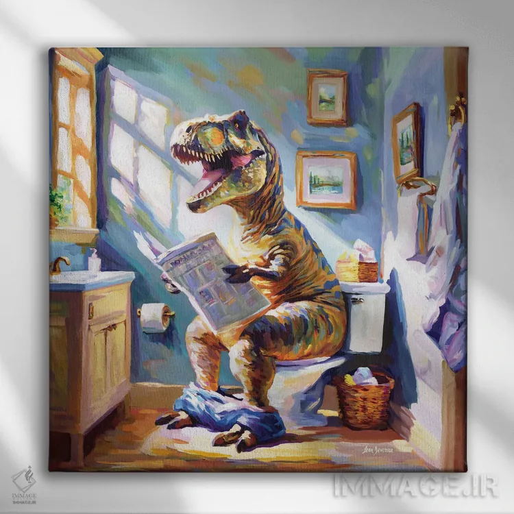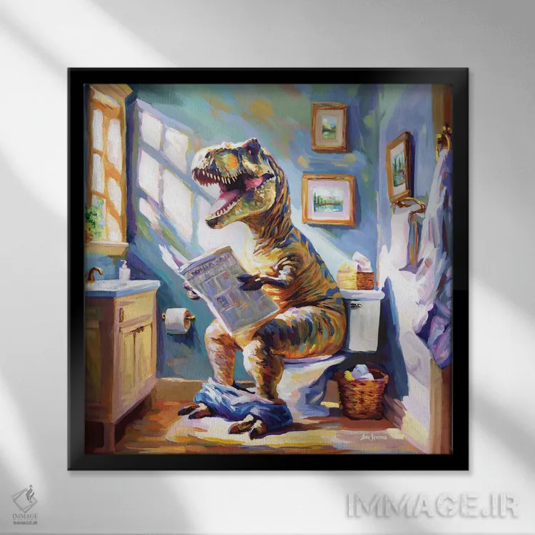 اگر به آثار حیوانات علاقه دارید، «طنز روزانه دایناسور» اثرِ «لئون دوونیس» فضا را صمیمیتر و دعوتکنندهتر نشان میدهد، برای اتاق کودک (بدون لحن کودکانه) گزینهٔ مناسبیست. با نورپردازی نقطهای، جذابتر هم میشود.