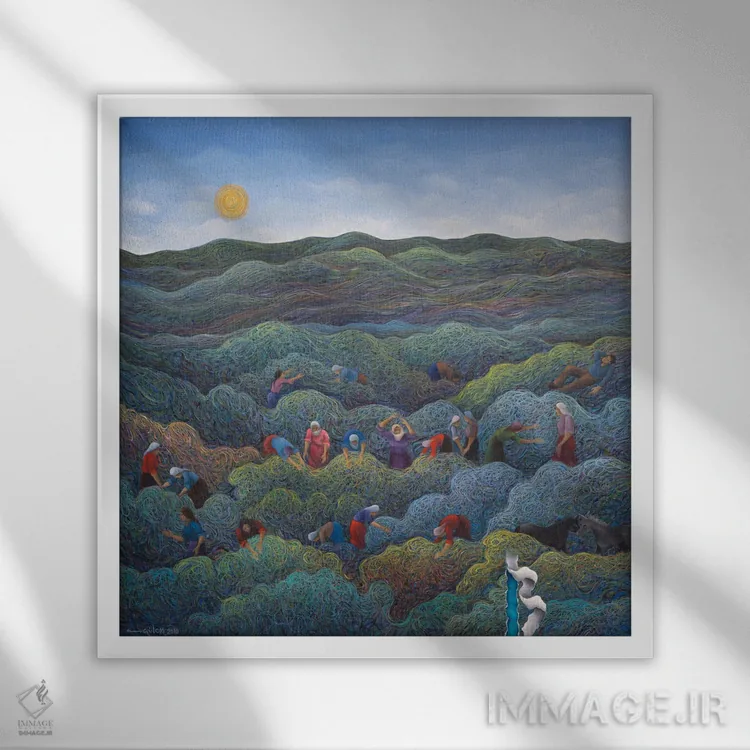 براساس پالت ترکیبی اثر، قاب تیک گرم (چوبی) پیشنهاد اول است و مشکی مات (فریم متوسط) مکمل. برای سفارشهای پروژهای با ابعاد و قابهای اختصاصی با ایماژ در تماس باشید.