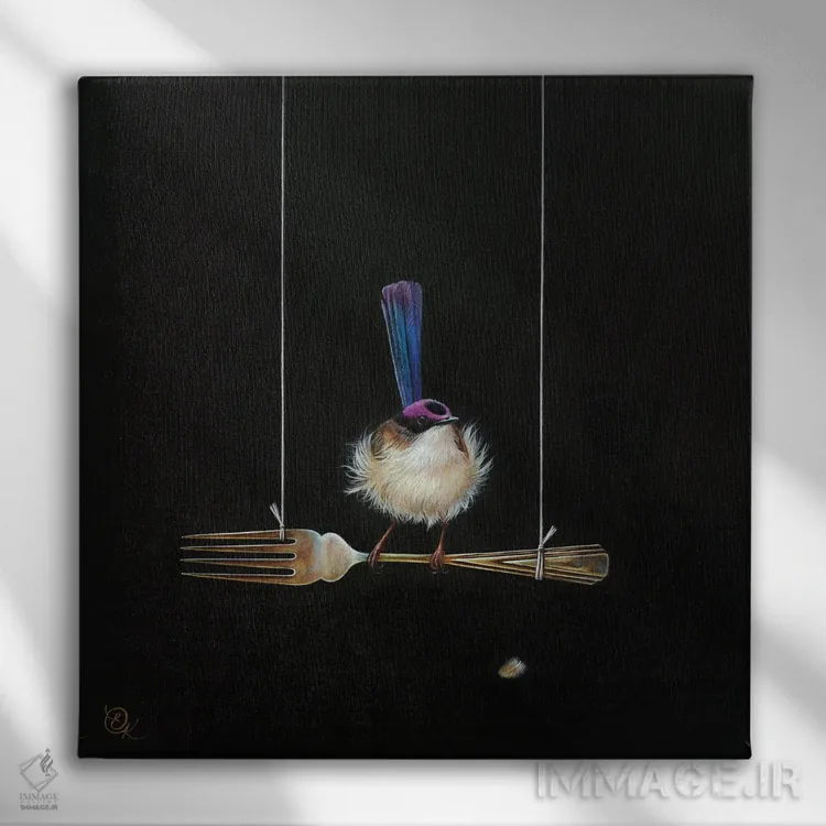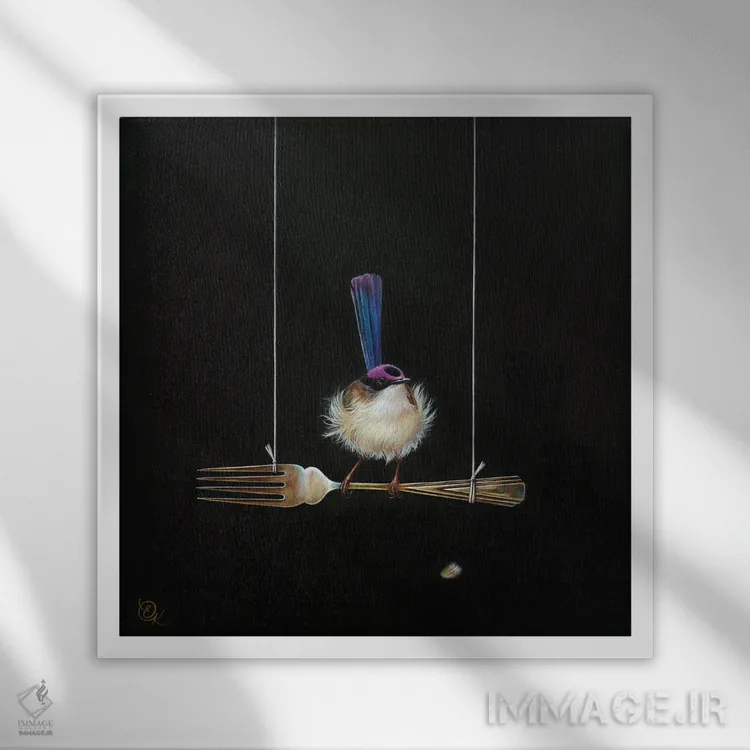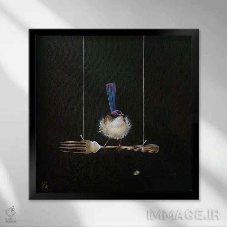 اگر به آثار حیوانات علاقه دارید، «پرنده پری با تاج بنفش روی چنگال (گونه پریآبی استرالیا)» اثرِ «النا کولوتوشا» یک لبخند ریز به چیدمان میدهد، برای دکورهایی با رنگهای خنثی گزینهٔ مناسبیست. حسش صمیمی است، اما کیفیتش جدی و خوشپرداخت.