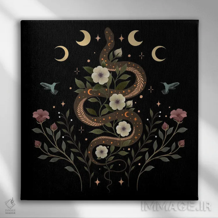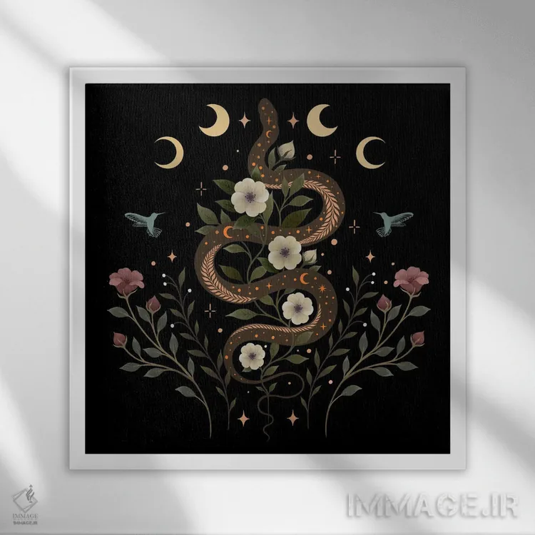 «افسون مار» اثرِ «اپیزودیک دراوینگ (برند هنری)» میتواند فضا را صمیمیتر و دعوتکنندهتر نشان بدهد؛ برای راهروها و ورودیهای گرم پیشنهاد میشود. هر بار نگاهش میکنید، یک جزئیات تازه به چشم میآید.