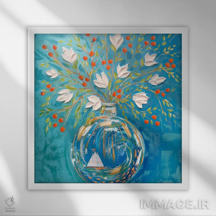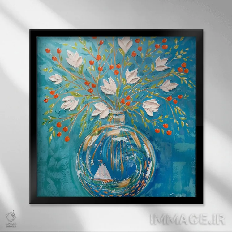 براساس پالت ترکیبی اثر، قاب تیک گرم (چوبی) پیشنهاد اول است و مشکی مات (فریم متوسط) مکمل. برای سفارشهای پروژهای با ابعاد و قابهای اختصاصی با ایماژ در تماس باشید.