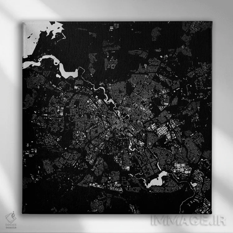 «نقشه شهری مینسک (سیاه)» اثرِ «اوربانمپ (نقشه شهری؛ استودیو نقشه یا طراح)» انتخابی شیک برای کنار خطوط صاف و متریالهای مدرن مثل بتن، فلز و چوب تیره.