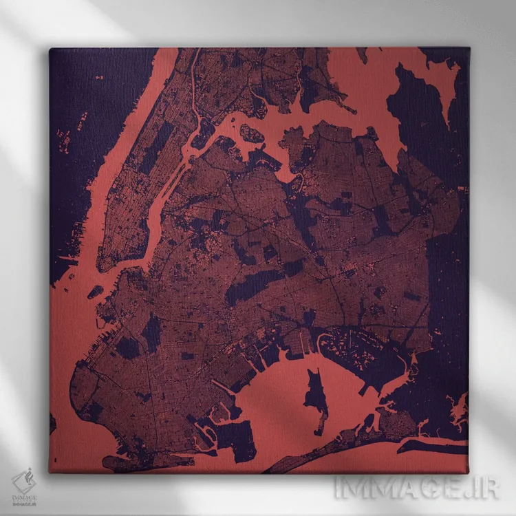 «نقشه شهری نیویورک (شب بنفش)» اثرِ «اوربانمپ (نقشه شهری؛ استودیو نقشه یا طراح)» در فضای هنری، بیشتر روی ریتمِ رنگ و فرم تکیه دارد و برای دکورهای مدرن عالی مینشیند.