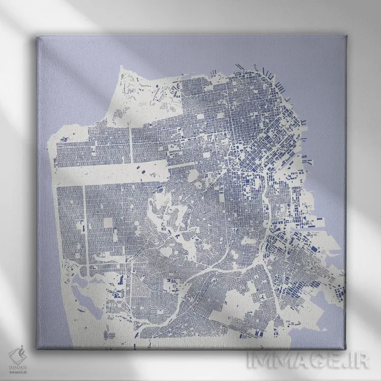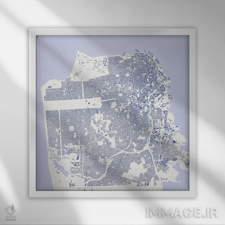 «نقشهٔ شهری سان فرانسیسکو (آبی)» اثرِ «اوربانمپ (نقشه شهری؛ استودیو نقشه یا طراح)» اگر میخواهید فضا کمی هنریتر و معاصرتر دیده شود، انتخاب خوبیست.
