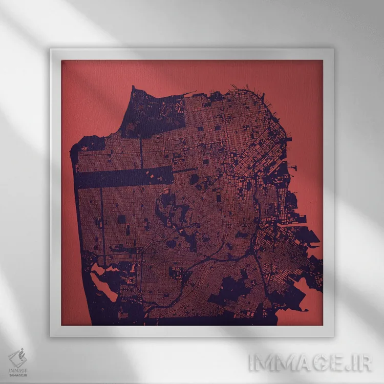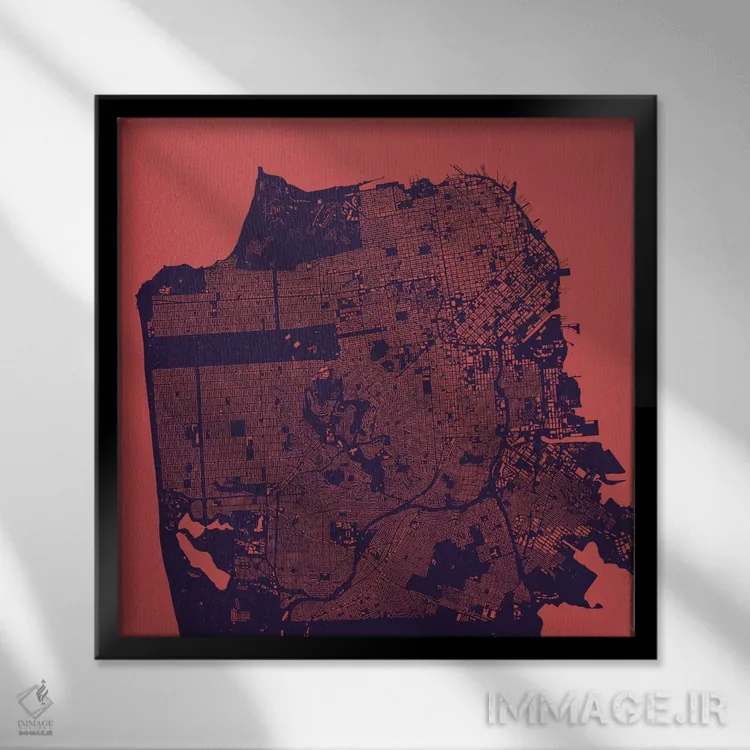 «نقشهٔ شهری سان فرانسیسکو (شب بنفش)» اثرِ «اوربانمپ (نقشه شهری؛ استودیو نقشه یا طراح)» در فضای هنری، بیشتر از روایت مستقیم، روی حس و فرم تکیه دارد؛ مناسب برای دکورهای مدرن.