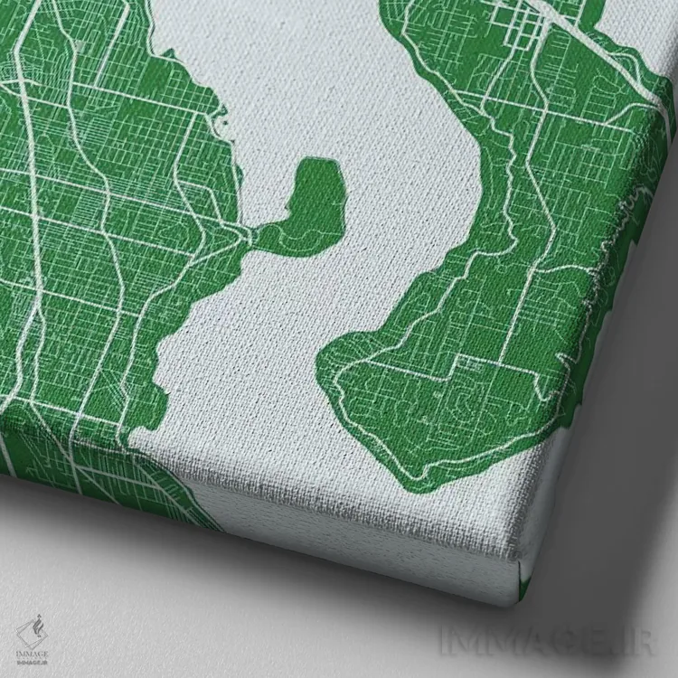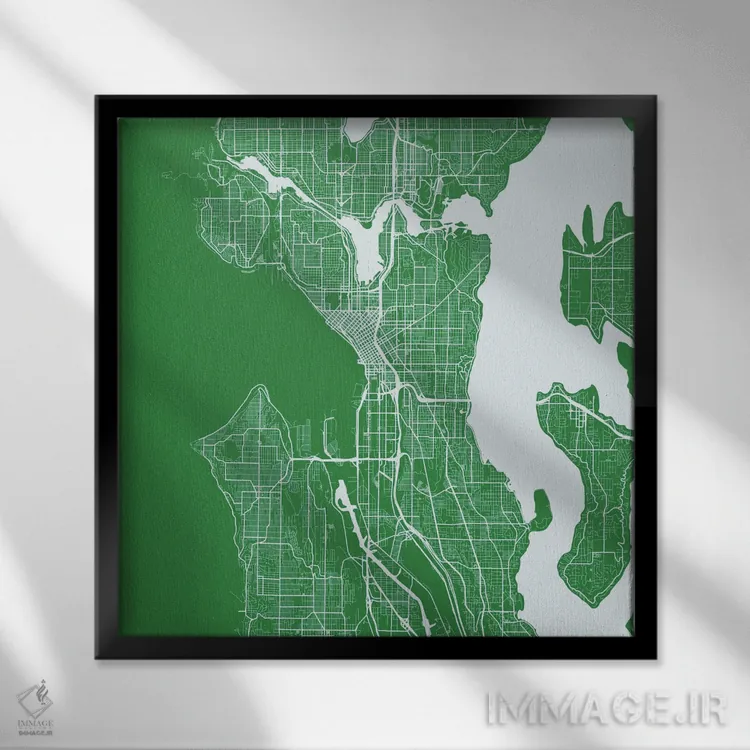 «نقشهٔ جادههای شهری سیاتل (سبز)» اثرِ «اوربانمپ (نقشه شهری؛ استودیو نقشه یا طراح)» انتخابی شیک برای کنار خطوط صاف و متریالهای مدرن مثل بتن، فلز و چوب تیره.
