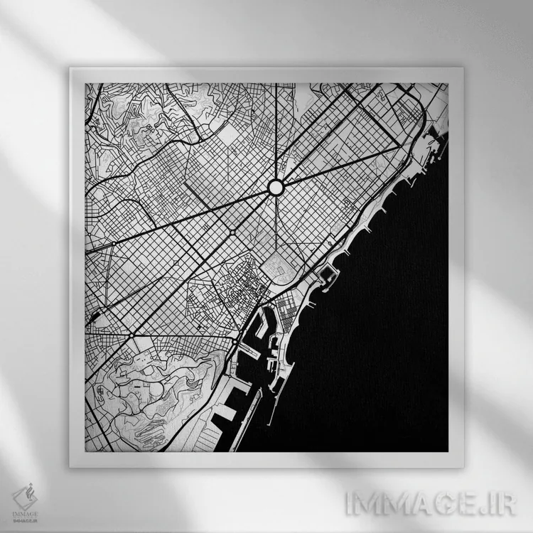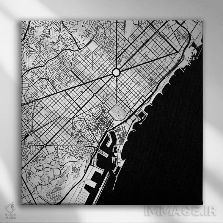 در «نقشهٔ شهری بارسلونا (سیاه)» اثرِ «اوربانمپ (نقشه شهری؛ استودیو نقشه یا طراح)»، ریتم بصری به چشم میآید؛ مناسب برای دیوار شاخص کنار مبلمان ساده.