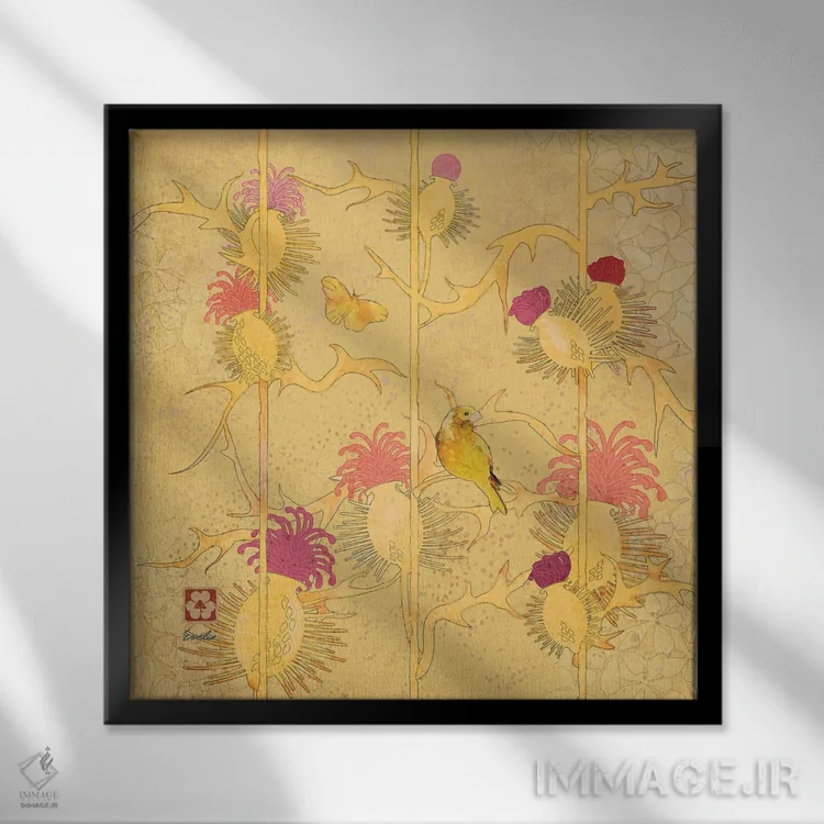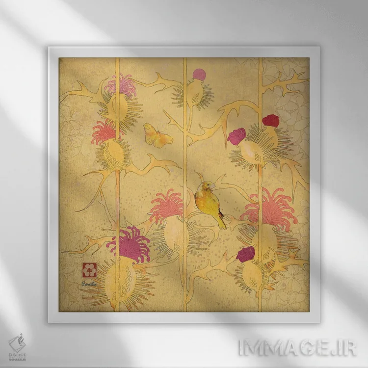 برای دیوارهای ساده، «افتاب پرست زرد بر گل خار» اثرِ «اولیا دیزاینز (استودیو طراحی)» به فضا، گرمیِ ملایم اضافه میکند؛ برای فضاهای روستیک یا بوهو انتخابی خوشسلیقه است. با نورپردازی نقطهای، جذابتر هم میشود.