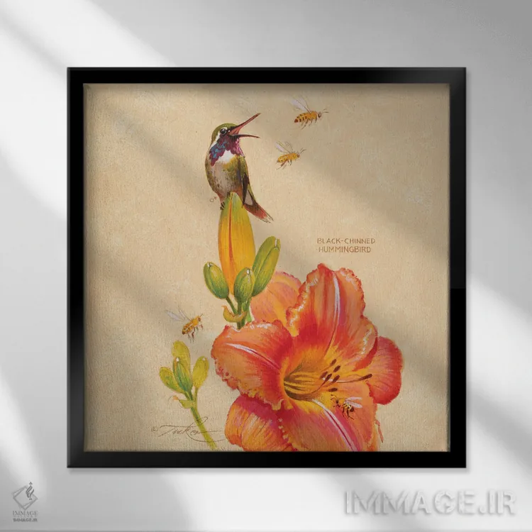تابلو دکوراتیو مرغ مگس خوار سیاه گلو، سوسن و زنبورهای عسل اثر ازرا تاکر