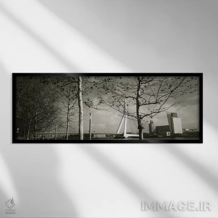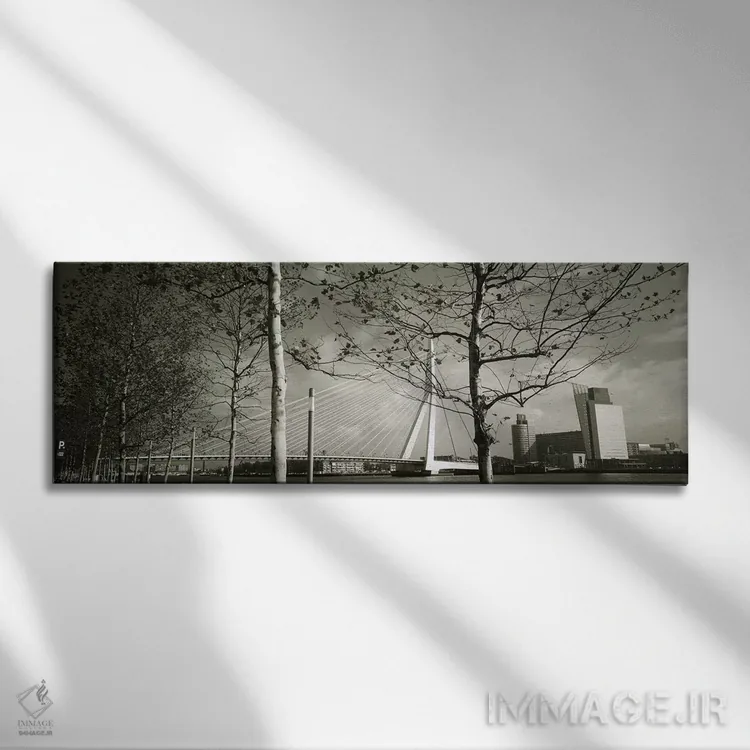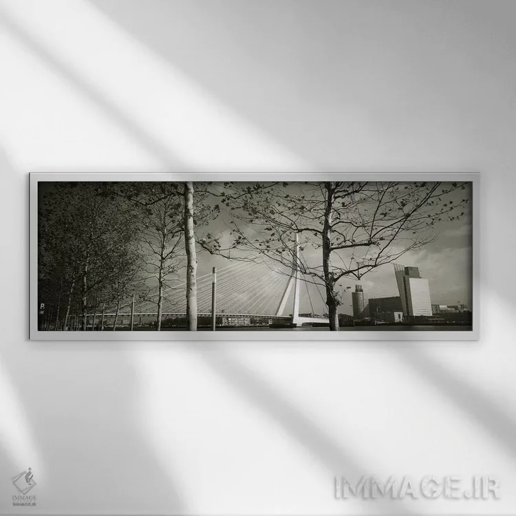 این اثر با عنوان «Rotterdam، South Holland، Netherlands، پل اراسموس از میان شاخههای درخت در تصویری سیاهوسفید، روتردام، هلند جنوبی، هلند» اثرِ «پانورامیک ایمجز (استودیو عکاسی عریض)» حس طراوت را بدون شلوغی وارد اتاق میکند؛ برای کنار میز آرایش یا کنسول انتخابی خوشسلیقه است. با قاب روشن یا چوبی، حس طبیعیتری پیدا میکند.