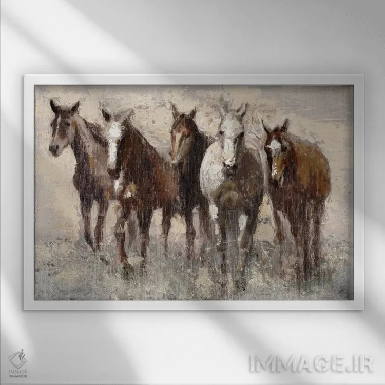 براساس پالت گرم اثر، قاب بلوط روشن (چوبی) پیشنهاد اول است و استخوانی ملایم مکمل. برای سفارشهای پروژهای با ابعاد و قابهای اختصاصی با ایماژ در تماس باشید.