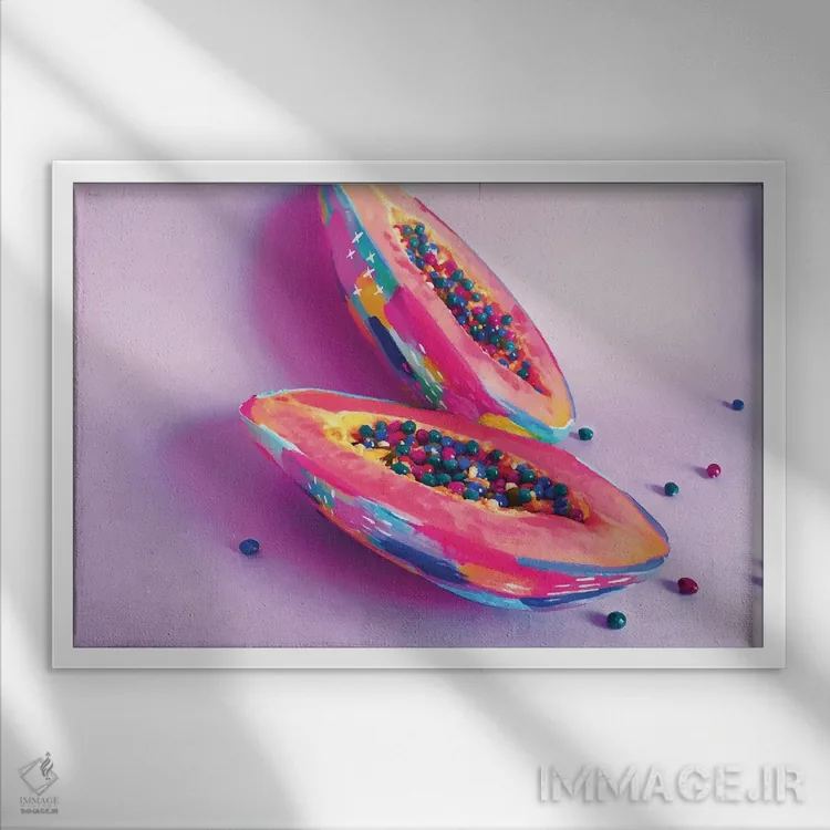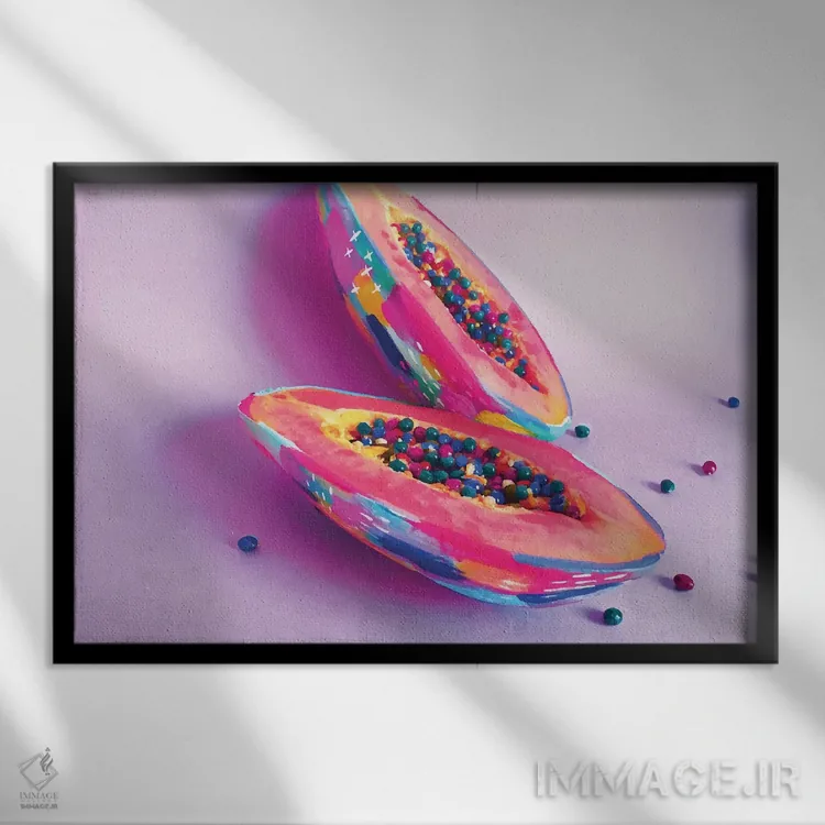 «پاپایا (میوهٔ گرمسیری)» اثرِ «اتاوی (برند هنری)» بهخاطر ساختار گرافیکیاش، کنار رنگهای خنثی و دکور صنعتی هم خوب جلوه میکند.