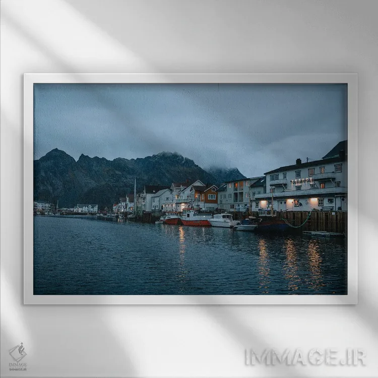 تابلو دروشن شدن چراغ‌ها در بندر نروژ اثر فابیان فورتمن - نمای قاب‌دار سفید