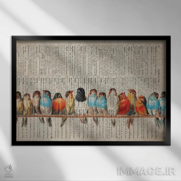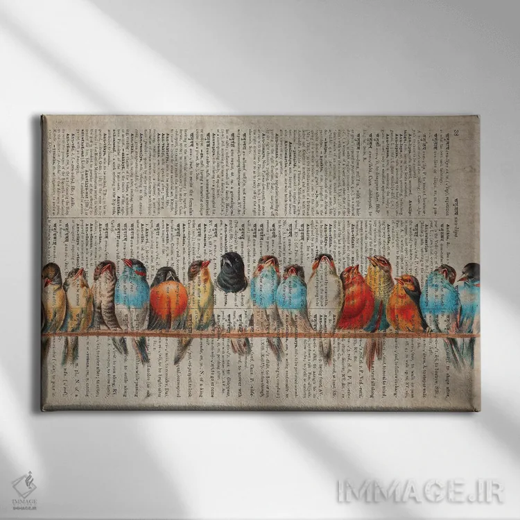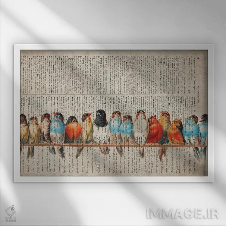 «پرندگان در یک صف روی صفحهٔ قدیمی فرهنگ لغت» اثرِ «فیشِرکرافت (استودیوی خلاقانه)» میتواند یک لبخند ریز به چیدمان بدهد؛ برای نشیمنهای خانوادگی پیشنهاد میشود. هر بار نگاهش میکنید، یک جزئیات تازه به چشم میآید.