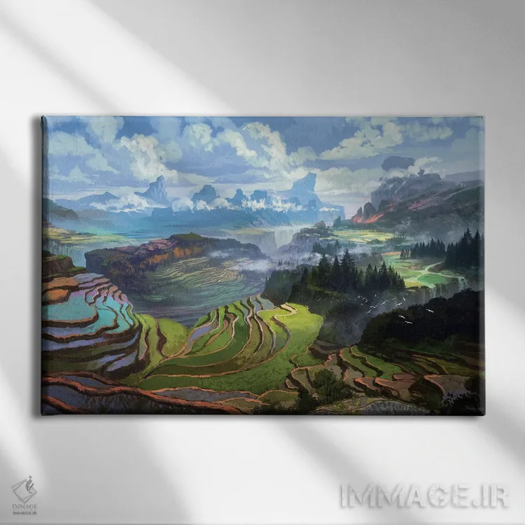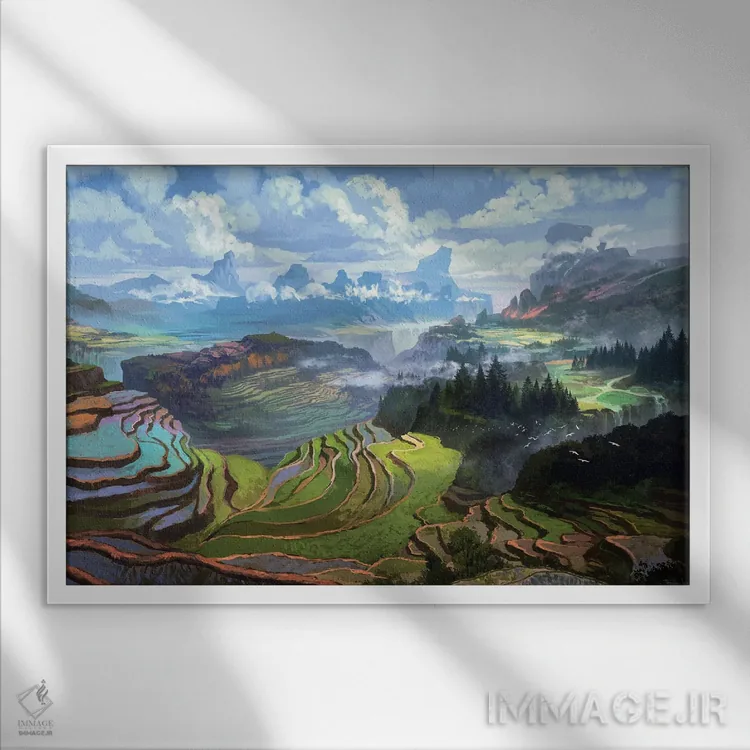 در «"کشتزارهای برنج"» اثرِ «فرباوراند لادرا»، توجه به جزئیاتِ گرافیکی و تعادل رنگی دیده میشود؛ مناسب برای دیوار شاخص.