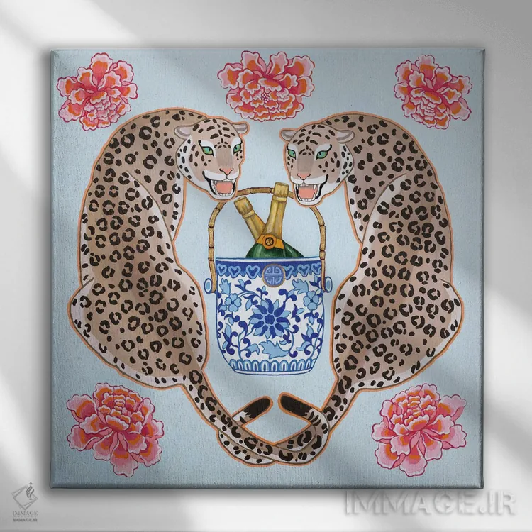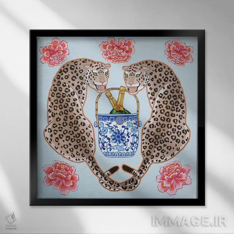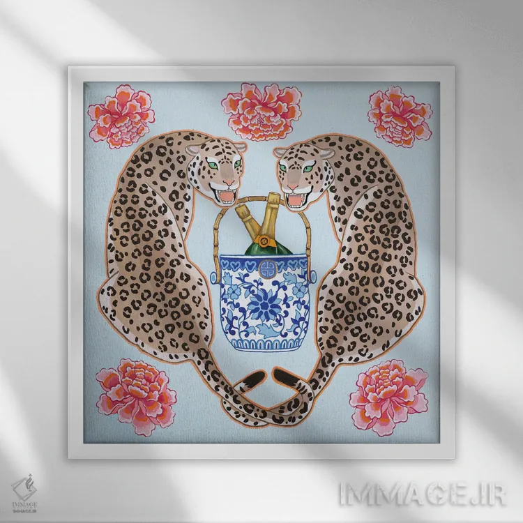 تابلو یوزپلنگهای چینی با سطل شامپاین آبی و سفید اثر گرین ارکید بوتیک (بوتیک هنری)