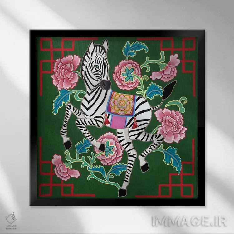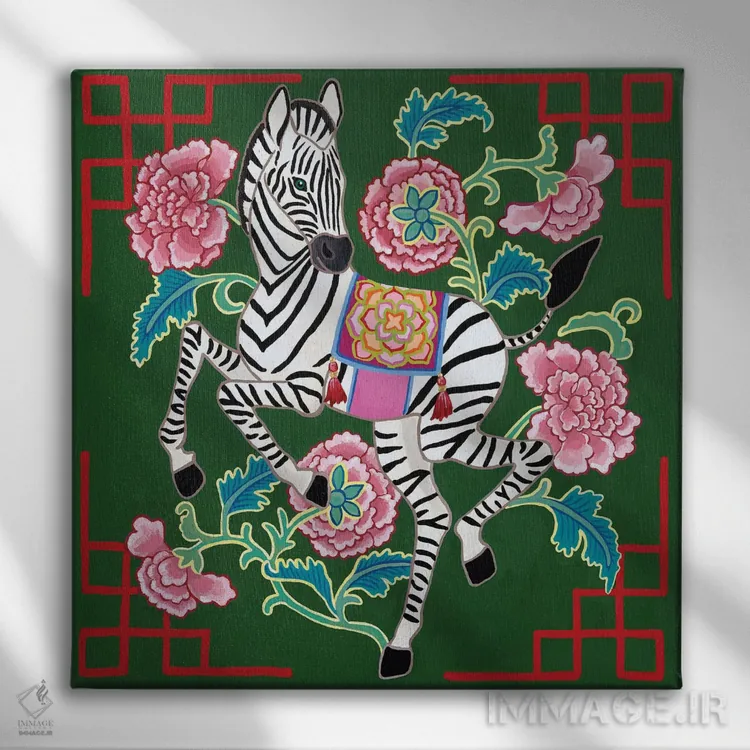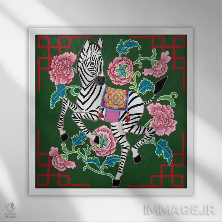 تابلو گورخر چینی با گل صدتومانی آسیایی اثر گرین ارکید بوتیک (بوتیک هنری)