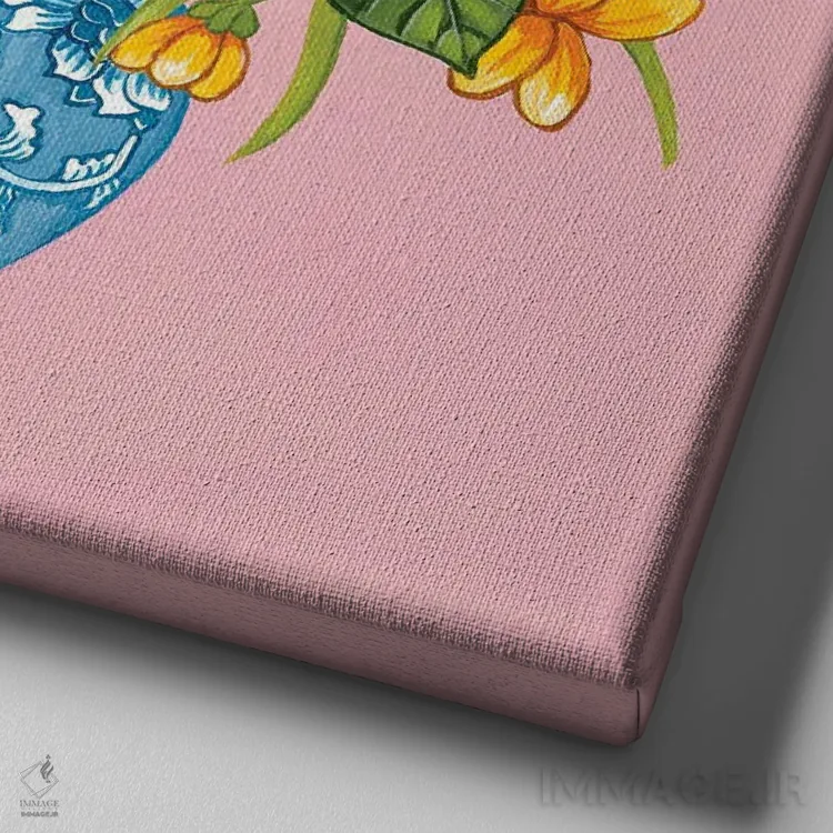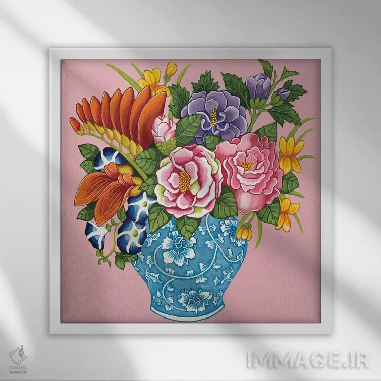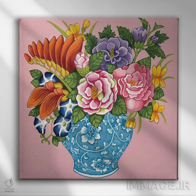 تابلو گلهای صدتومانی و رز چینی در کوزه زنجبیلی آبی و سفید روی صورتی اثر گرین ارکید بوتیک (بوتیک هنری)