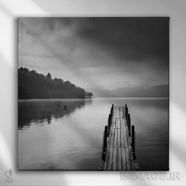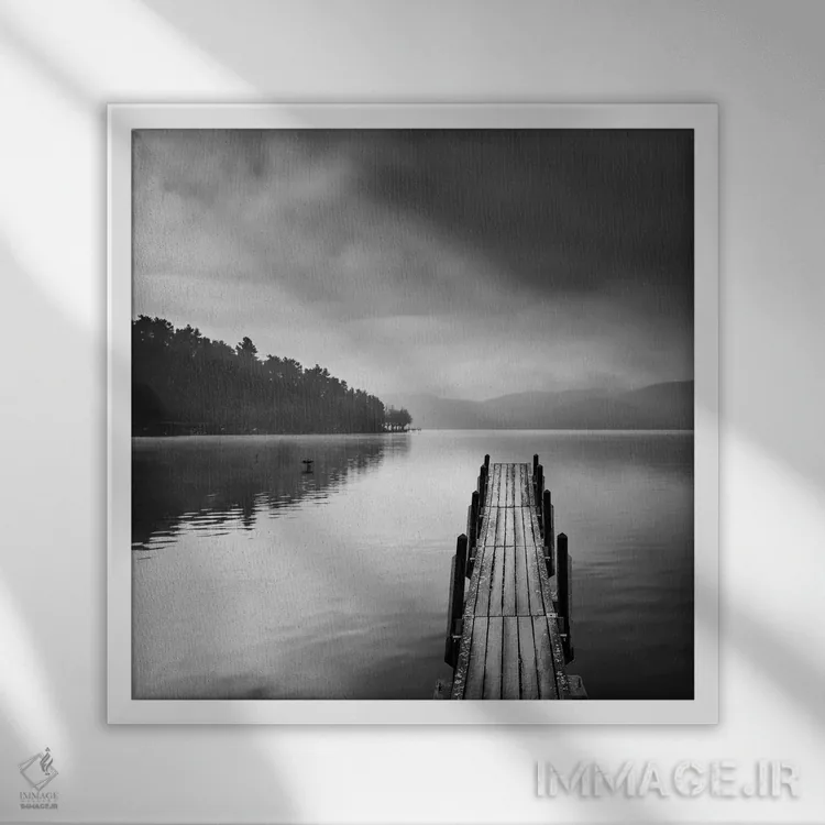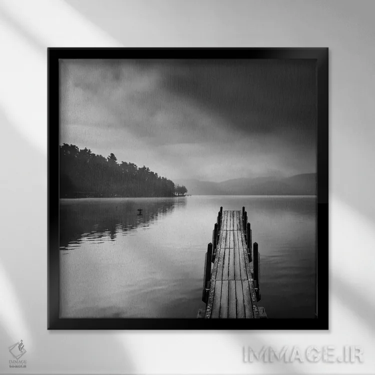 «نمای دریاچه با اسکله ۲» اثرِ «جورج دیگالاکیس» در فضای عکاسی سیاهوسفید، روی نور و کنتراست تکیه میکند؛ موضوعِ این اثر برای دکورهای مینیمال عالی است.
