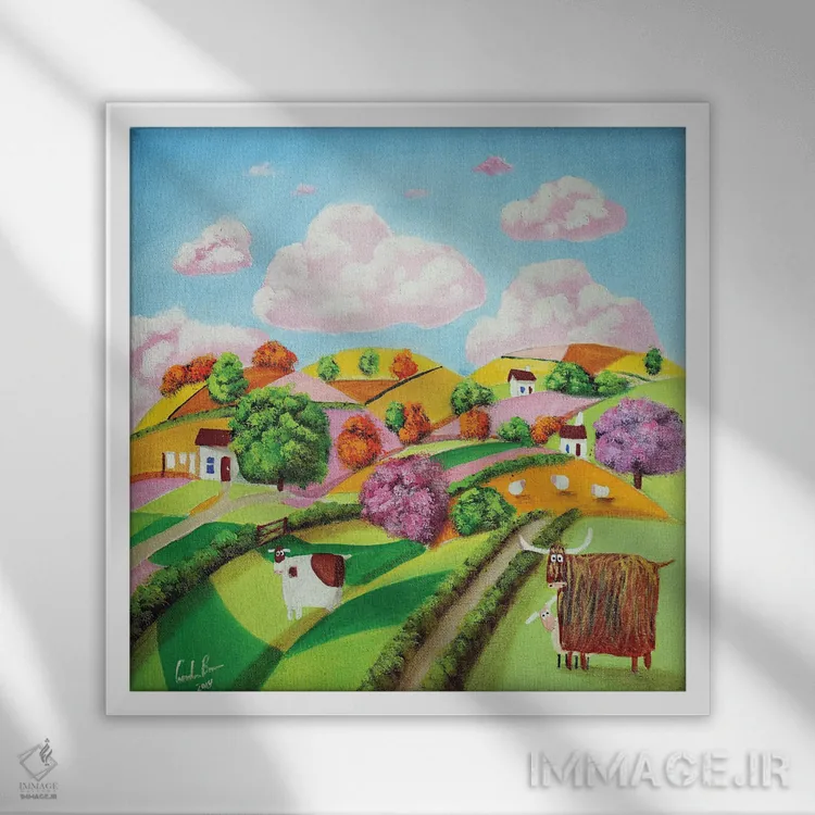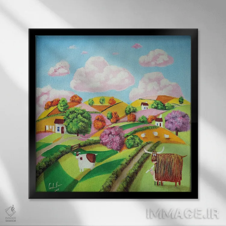 براساس پالت ترکیبی اثر، قاب تیک گرم (چوبی) پیشنهاد اول است و مشکی مات (فریم متوسط) مکمل. برای سفارشهای پروژهای با ابعاد و قابهای اختصاصی با ایماژ در تماس باشید.