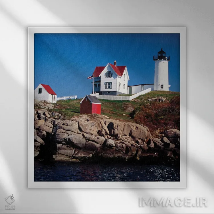 تابلو نمای فانوس دریایی کیپ ندیک، یورک، مین، آمریکا اثر جورج اوزه - نمای قاب‌دار سفید