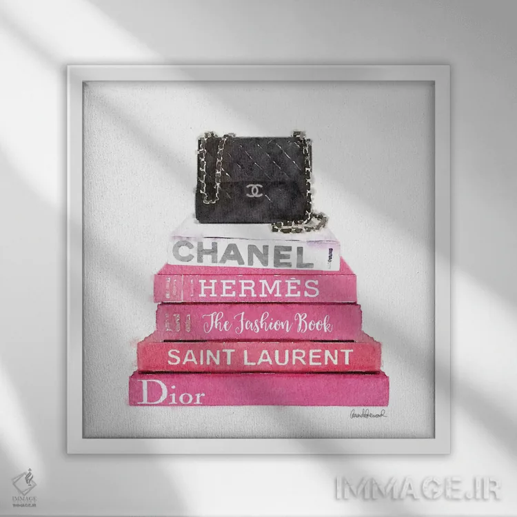 تابلو دکوراتیو کتاب های مد صورتی با یک کیف مشکی اثر آماندا گرینوود