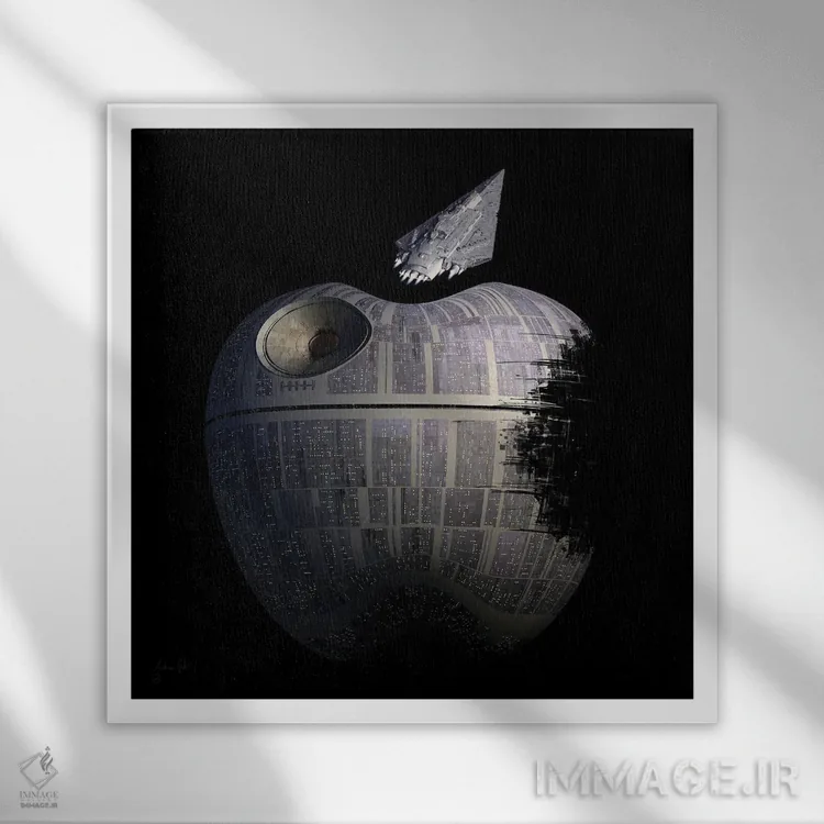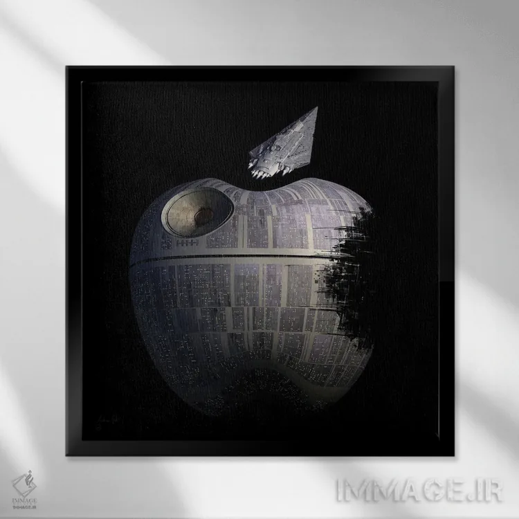 «سیب ستاره مرگ (الهام از جنگ ستارگان)» اثرِ «آندریا گاتی» یک قاب مدرن و خوشفرم است؛ موضوعِ این اثر در اجرای هنری خوانا و سئوپذیرِ دیواری میشود.