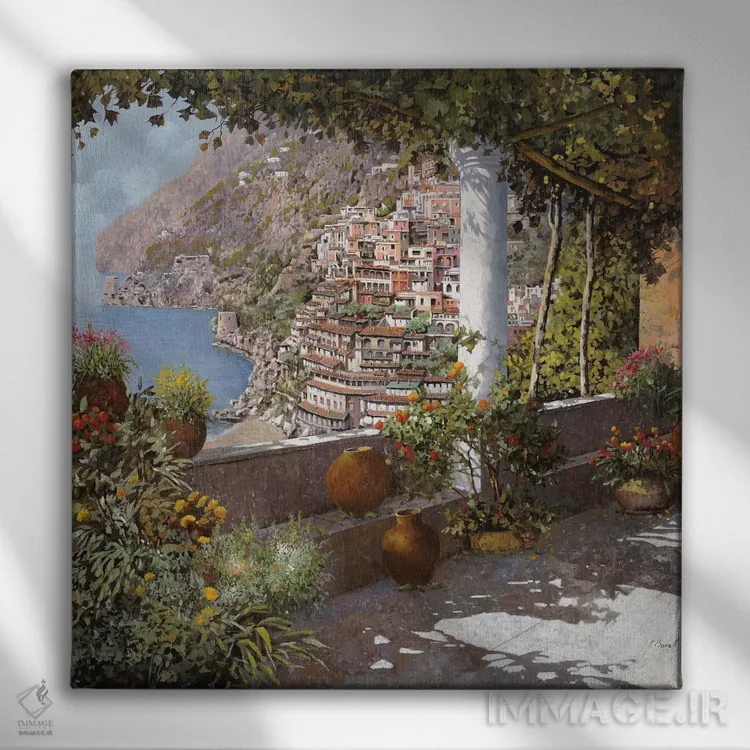«تراس در پوزیتانو» اثرِ «گویدو بورلی» یک قاب دکوراتیوِ خوشخوان است؛ این اثر در آن بهجای اغراق، با ظرافت و تناسب دیده میشود.