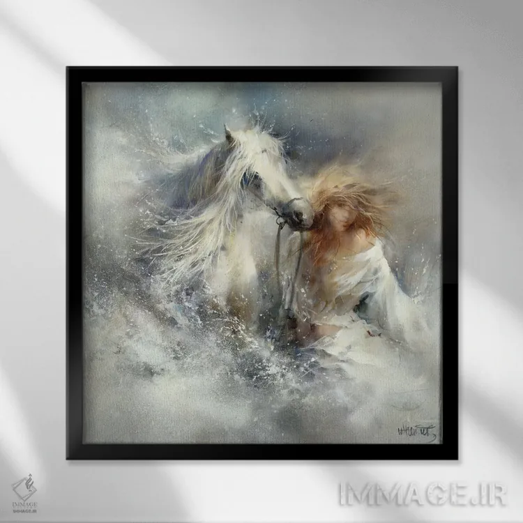 براساس پالت گرم اثر، قاب بلوط روشن (چوبی) پیشنهاد اول است و استخوانی ملایم مکمل. برای سفارشهای پروژهای با ابعاد و قابهای اختصاصی با ایماژ در تماس باشید.