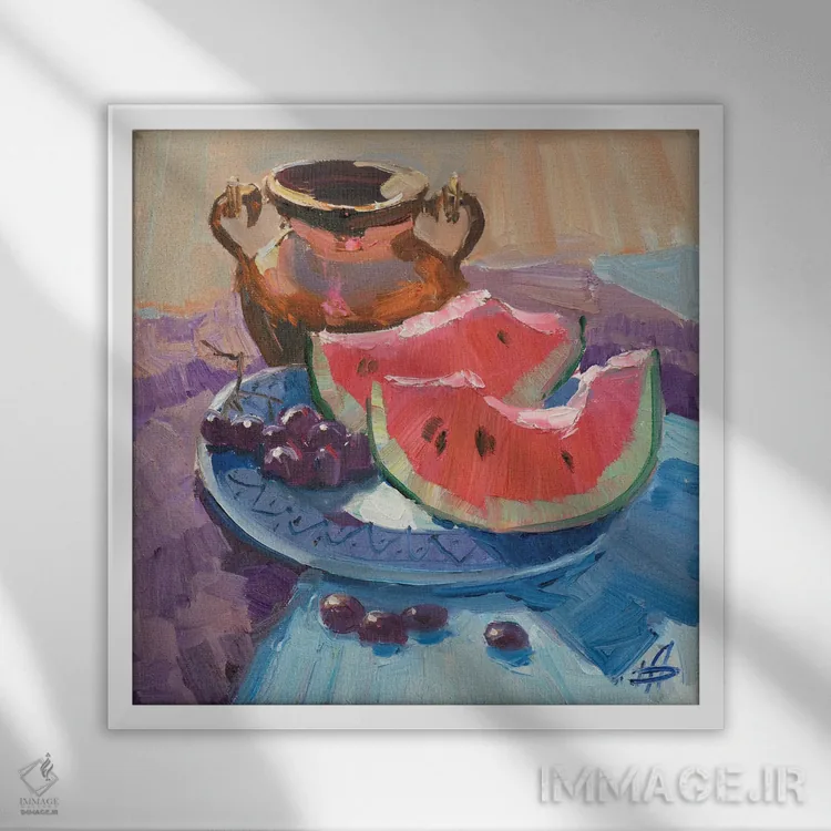 براساس پالت ترکیبی اثر، قاب تیک گرم (چوبی) پیشنهاد اول است و مشکی مات (فریم متوسط) مکمل. برای سفارشهای پروژهای با ابعاد و قابهای اختصاصی با ایماژ در تماس باشید.