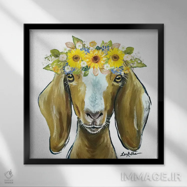 تابلو دکوراتیو ماج بز با تاج گل آفتابگردان اثر هیپی هاوند استودیوز