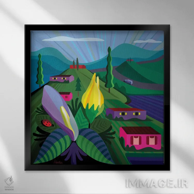 براساس پالت ترکیبی اثر، قاب تیک گرم (چوبی) پیشنهاد اول است و مشکی مات (فریم متوسط) مکمل. برای سفارشهای پروژهای با ابعاد و قابهای اختصاصی با ایماژ در تماس باشید.