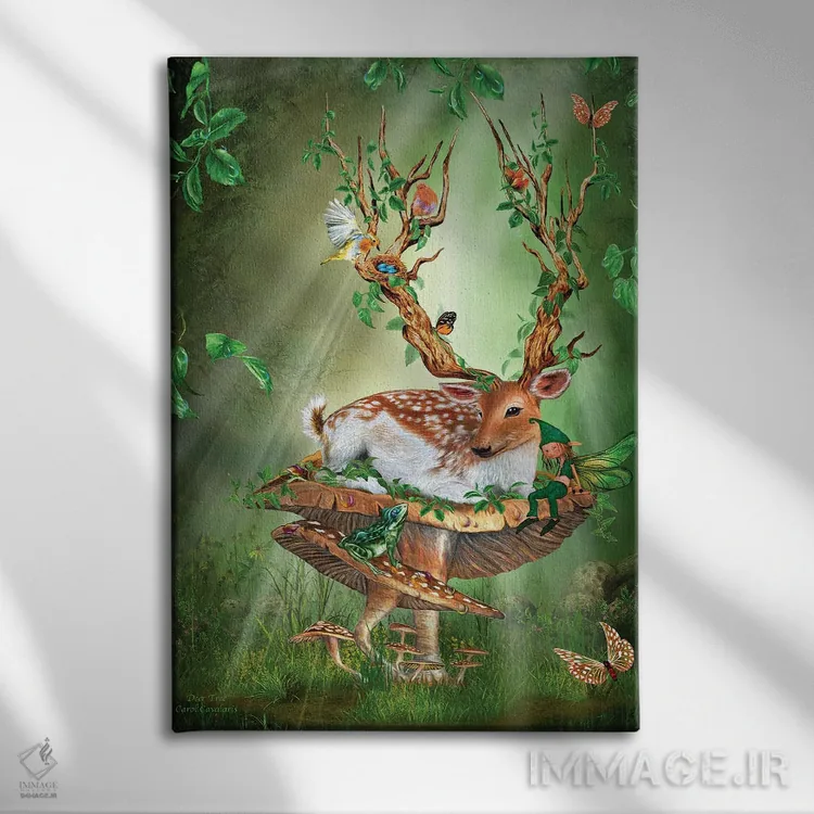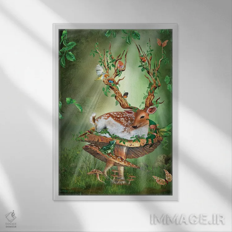 اگر میخواهید دیوار کمی سرزندگیِ محترمانه داشته باشد، «درخت گوزن (نقاشی فانتزی)» اثرِ «کارول کاوالاریس» گرما و شخصیت به فضا اضافه میکند، برای اتاق کودک (بدون لحن کودکانه) گزینهٔ مناسبیست. با قاب چوبی یا مشکی، حس مرتبتری پیدا میکند.
