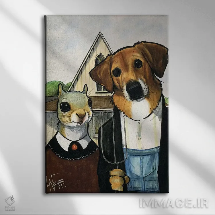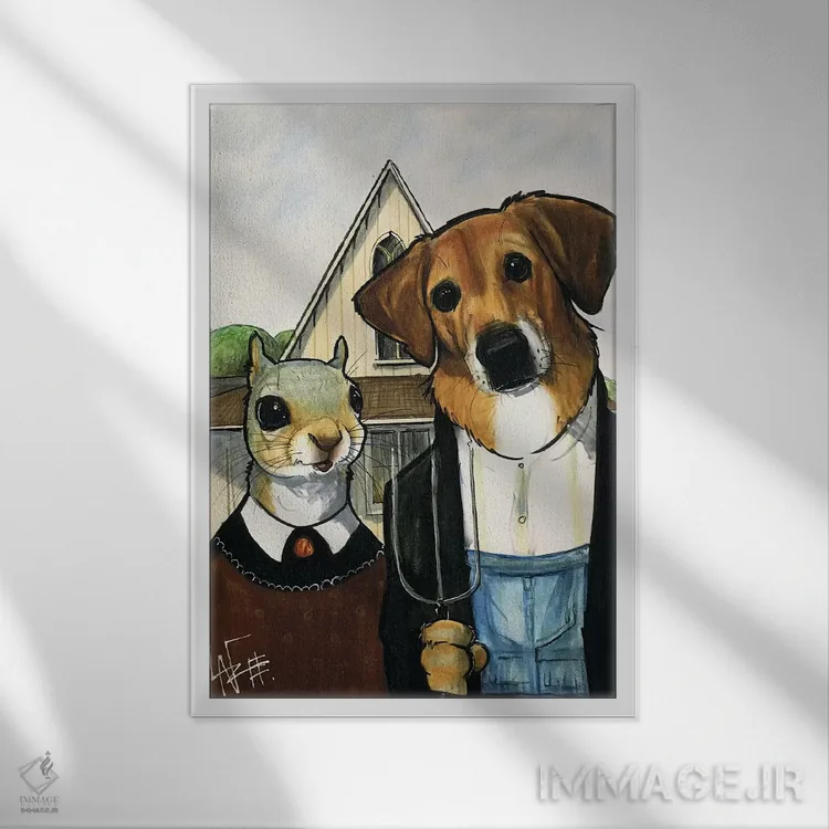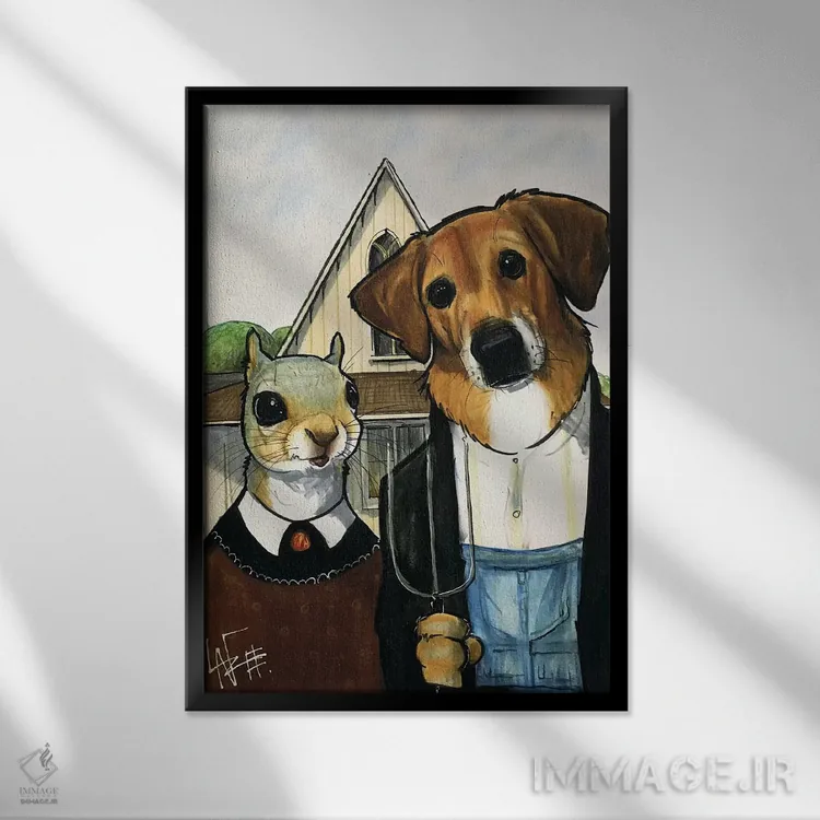 برای دیواری که میخواهید سلیقهتان را آرام و دقیق نشان بدهد، «سگ میکس سبک گوتیک آمریکایی» اثرِ «کاریکاتورهای سگ (استودیو تخصصی کاریکاتور حیوانات)» جلوهٔ رنگها را طبیعیتر و متعادلتر نشان میدهد؛ برای کنار کتابخانه یا میز کار پیشنهاد میشود. یک انتخاب خوشسلیقه است که با گذر زمان هم تازه میماند.