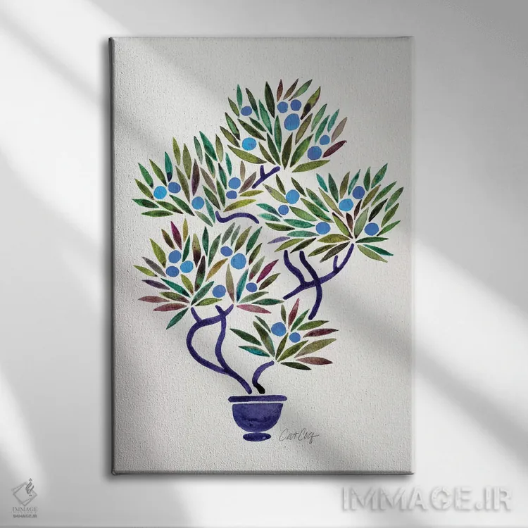 اگر دوست دارید دیوار روشنتر و آرامتر دیده شود، «بونسای آبی و نارنجی» اثرِ «کت کوکیلت» تعادل رنگیِ لطیفی به چیدمان میدهد، برای اتاق خواب گزینهٔ مناسبیست. حضورش آرام است، اما بیاثر نیست.