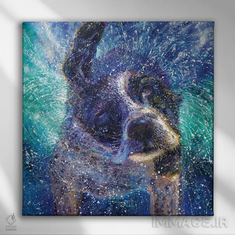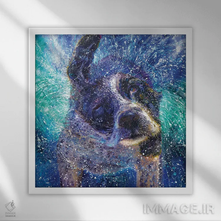 برای دکورهای صمیمی، «اسپنایل چرخان (نوعی سگ)» اثرِ «آیریس اسکات» به دیوار، انرژیِ نرم و زنده میدهد؛ برای راهروها و ورودیهای گرم انتخابی خوشسلیقه است. هر بار نگاهش میکنید، یک جزئیات تازه به چشم میآید.