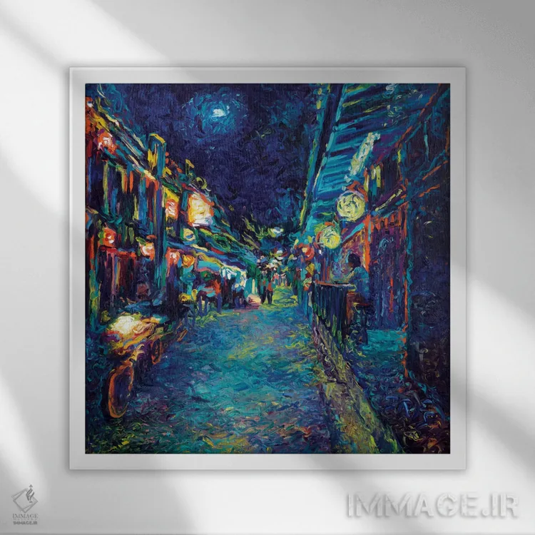 براساس پالت ترکیبی اثر، قاب تیک گرم (چوبی) پیشنهاد اول است و مشکی مات (فریم متوسط) مکمل. برای سفارشهای پروژهای با ابعاد و قابهای اختصاصی با ایماژ در تماس باشید.
