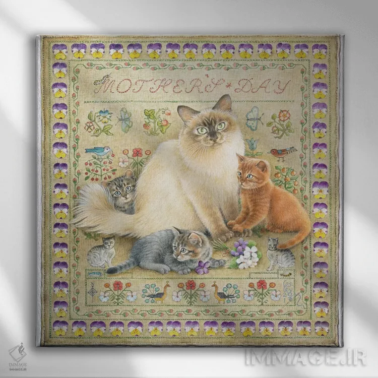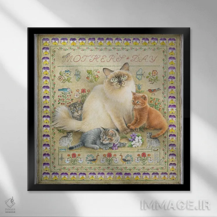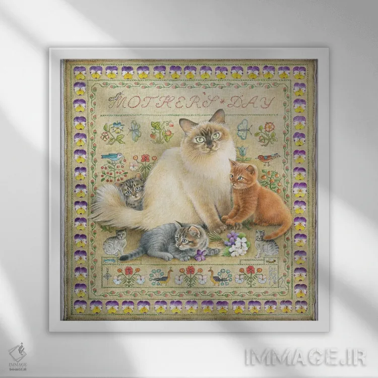 اگر میخواهید دیوار کمی سرزندگیِ محترمانه داشته باشد، «روز مادر با ادت و بچهگربههایش» اثرِ «آیوری کتس (برند هنری نقاشی گربه)» در کنار رنگهای خنثی، تضاد دلچسبی میسازد، برای راهروها و ورودیهای گرم گزینهٔ مناسبیست. با نورپردازی نقطهای، جذابتر هم میشود.