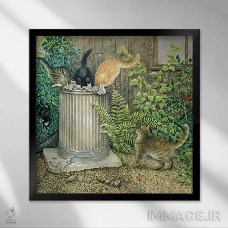 برای دکورهای صمیمی، «کار گروهی در سطل زبالهٔ همسایه» اثرِ «آیوری کتس (برند هنری نقاشی گربه)» گرما و شخصیت به فضا اضافه میکند؛ برای دکورهایی با رنگهای خنثی انتخابی خوشسلیقه است. با قاب چوبی یا مشکی، حس مرتبتری پیدا میکند.