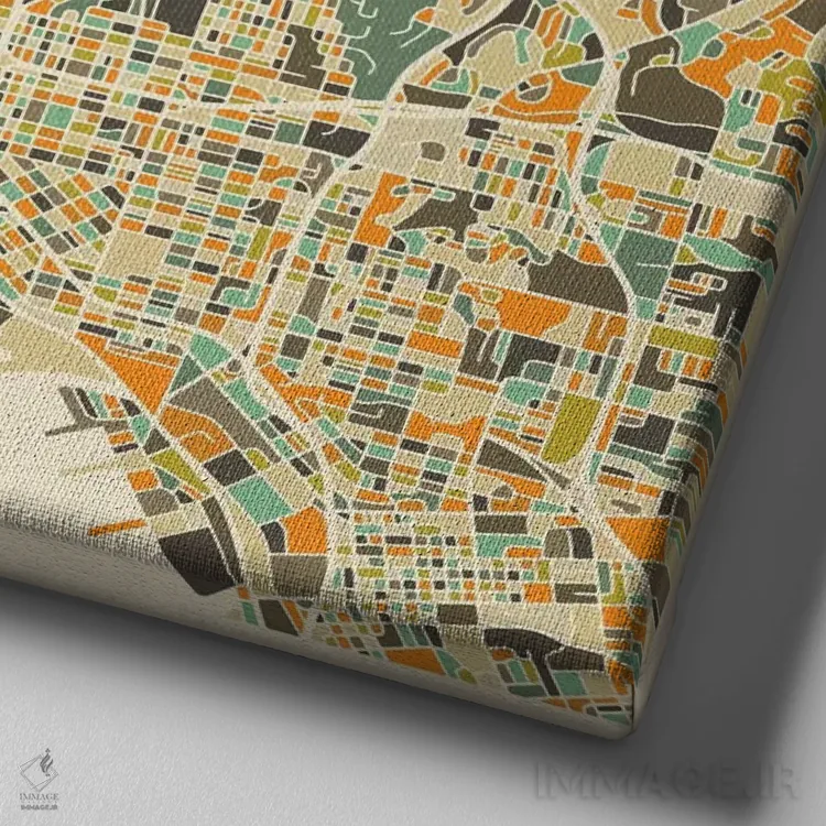 «نقشه انتزاعی شهر سن دیگو» اثرِ «جازبری بلو (هنرمند مدرن/برند هنری)» بهخاطر فرمهای آزادش، در فضاهای خنثی بهتر دیده میشود و عمق بصری ایجاد میکند.