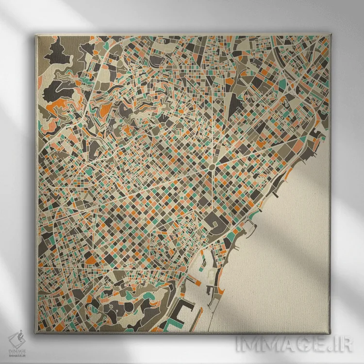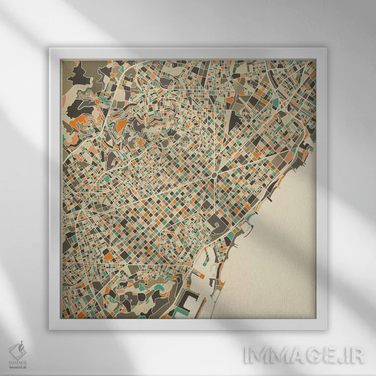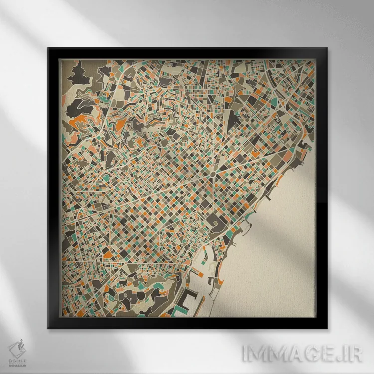 «نقشه انتزاعی شهر بارسلونا» اثرِ «جازبری بلو (هنرمند مدرن/برند هنری)» با لحن هنری، نقطهٔ کانونی میسازد بدون اینکه فضا را شلوغ کند.