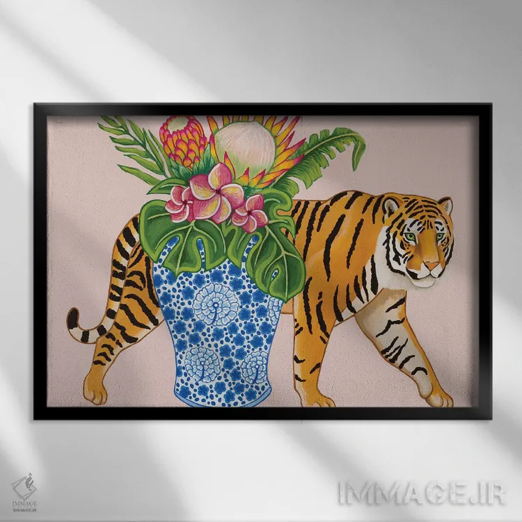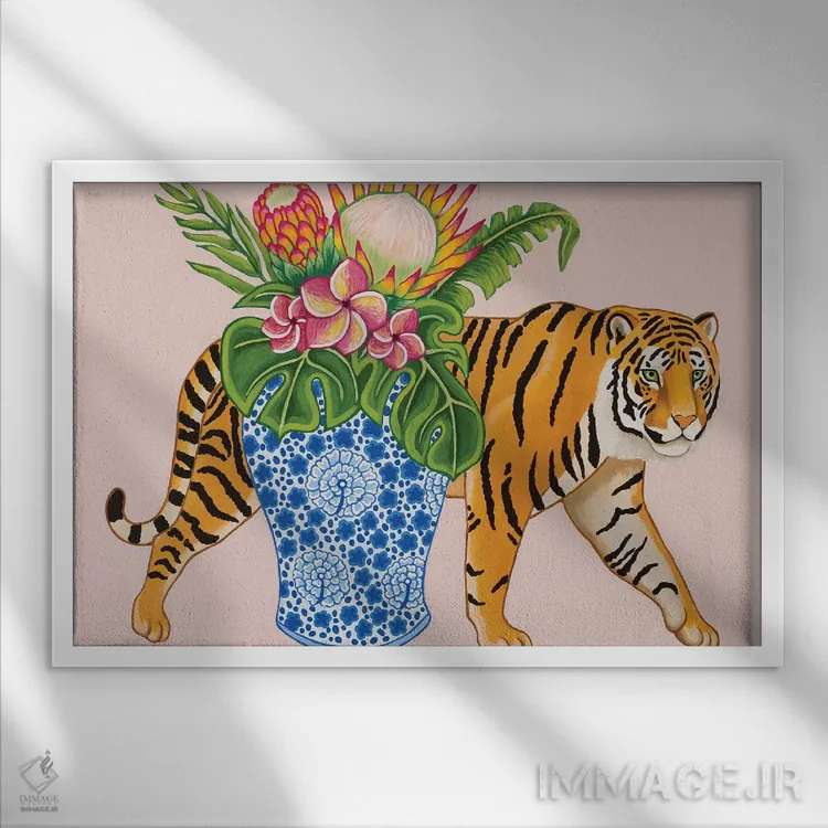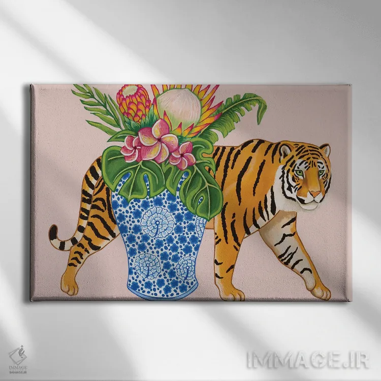 در «ببر چینی با گلدان زنجبیلی آبی و سفید، مانسترا و پلومریا» اثرِ «گرین ارکید بوتیک (بوتیک هنری)»، حضور حیوانات به فضا، گرمیِ ملایم اضافه میکند؛ برای فضاهای روستیک یا بوهو انتخابی خوشسلیقه است. به دیوار، قصه میدهد—اما قصهای آرام و شیک.