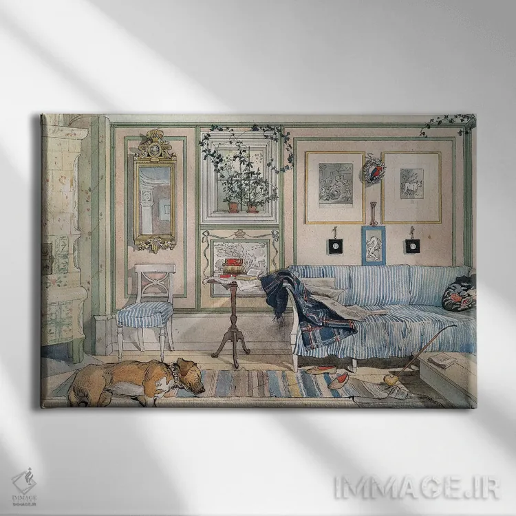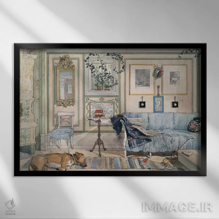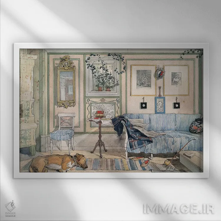 «C1895، لارشون: خانه، حدود ۱۸۹۵» اثرِ «کارل لارسون (نقاش و تصویرگر سوئدی)» با حالوهوای تزئینیِ این اثر، فضا را روشن و مرتب میکند؛ مناسب نشیمنهای روشن و چیدمانهای مدرن.