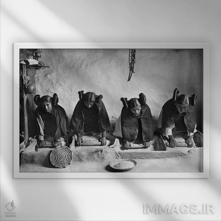 «C1906، قبایل هوپی: آرد کردن غلات، حدود ۱۹۰۶» اثرِ «ادوارد اس. کرتیس (عکاس پرتره بومیان آمریکا)» یک قاب دکوراتیوِ گرم و دلنشین است؛ این اثر در اجرای پرداختِ هنری، فضا را نرمتر و صمیمیتر نشان میدهد.