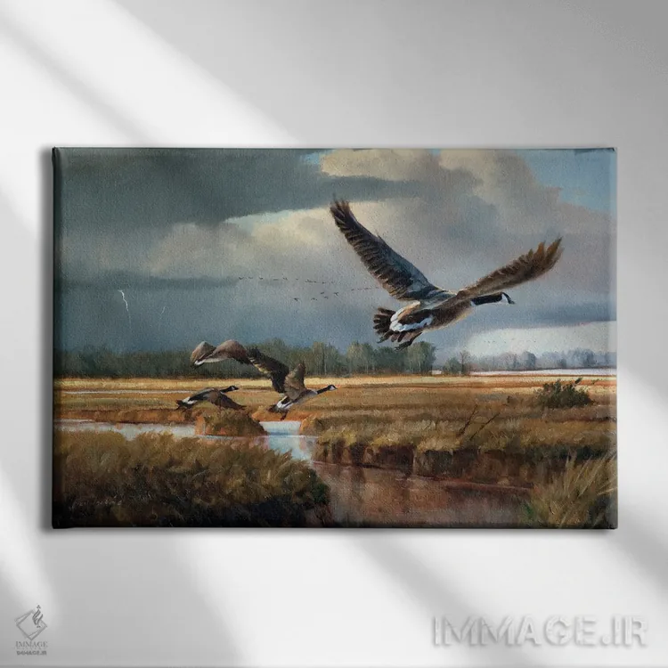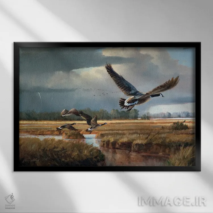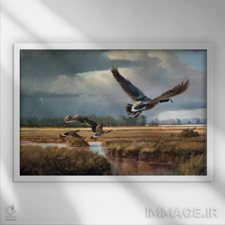 تابلو دکوراتیوِ «تغییر آب و هوا—غازهای کانادایی» با موضوع حیوانات؛ هم برای نشیمن و هم برای اتاق کودک انتخاب خوبی است اثرِ «گرانت هکینگ».