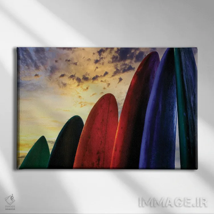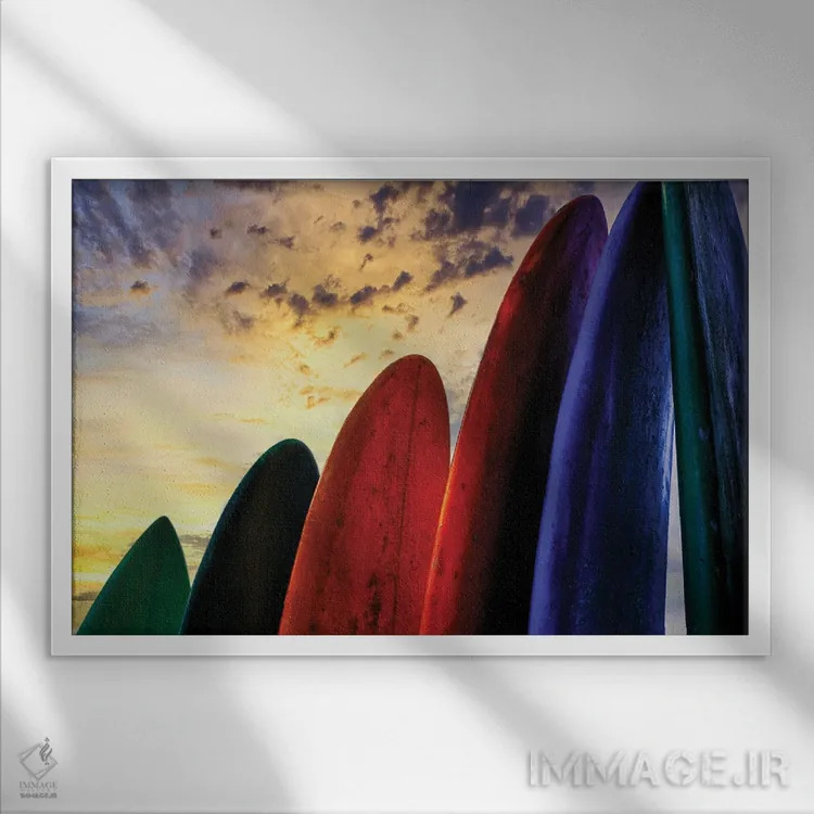 «تختههای موجسواری چیده شده پس از غروب، بعد از یک روز کلاس موجسواری در چانگو، بالی، اندونزی» اثرِ «گرگ جانستون» انتخابیست برای زمانی که یک «نقطهٔ مکث» خوشسلیقه میسازد؛ برای دیوارهای گالریوار و ترکیب چند اثر انتخابی عالی است. برای ترکیب با چوب، سنگ یا فلز، انتخابی دقیق است.